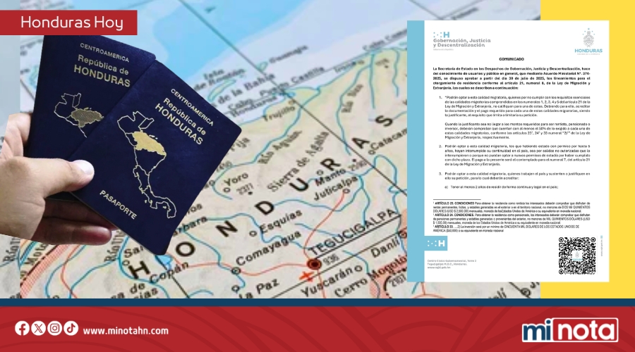 La Secretaría de Estado en los Despachos de Gobernación, Justicia y Descentralización, emitió el Acuerdo Ministerial N.º 374‑2025, mediante el cual se establecen nuevos lineamientos para la residencia migratoria especial, a partir del 30 de julio 2025, conforme lo previsto en el artículo 21, numeral 8 de la Ley de Migración y Extranjería.