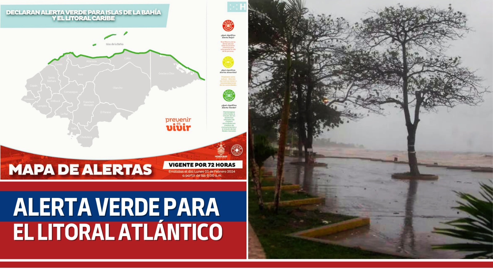 COPECO, informa de alerta verde para el departamento de Islas de la Bahía y el litoral atlántico, desde el departamento de Cortés hasta Gracias a Dios, a causa del oleaje alterado de hasta siete pies, por un período de 72 horas, a partir de las 6:00 de la mañana de hoy lunes 5 de febrero de 2024.