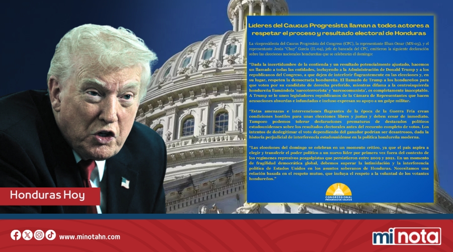 El Caucus Progresista del Congreso (CPC) del Partido Demócrata de Estados Unidos, una influyente bancada en el Capitolio, emitió un enérgico comunicado exigiendo el respeto al proceso y resultado electoral de Honduras que se celebrará este domingo.