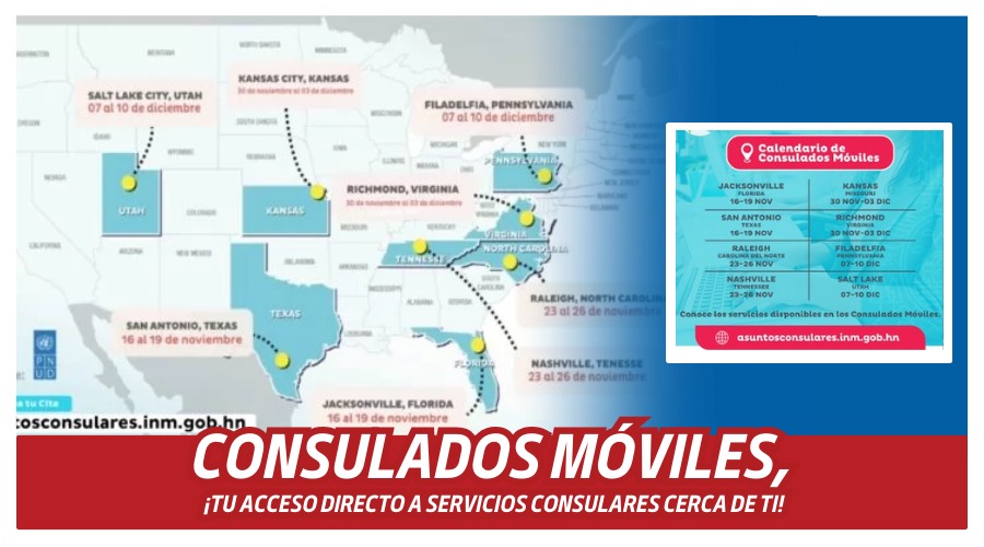 ¡Atención a la comunidad hondureña en Estados Unidos! Nos complace informar que a partir de hoy, 16 de noviembre, los Consulados Móviles estarán disponibles en Jacksonville, Florida, y San Antonio, Texas. Esta iniciativa tiene como objetivo facilitar trámites y servicios consulares para nuestros compatriotas.