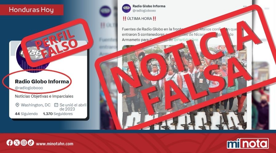 Una cuenta falsa en la red social X, que se hace pasar por el medio de comunicación Radio Globo, ha difundido en las últimas horas una publicación donde se afirma que “cinco contenedores provenientes de Nicaragua, cargados de armamento, ingresaron al país para colectivos del Partido Libre”.