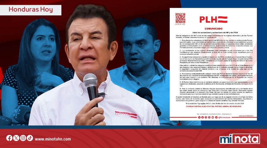 Aunque el PLH asegura que se trata de una “persecución política”, su comunicado termina alineando al partido con el Partido Nacional de Honduras (PNH) respaldando a funcionarios que pretenden alterar la transparencia del proceso electoral.