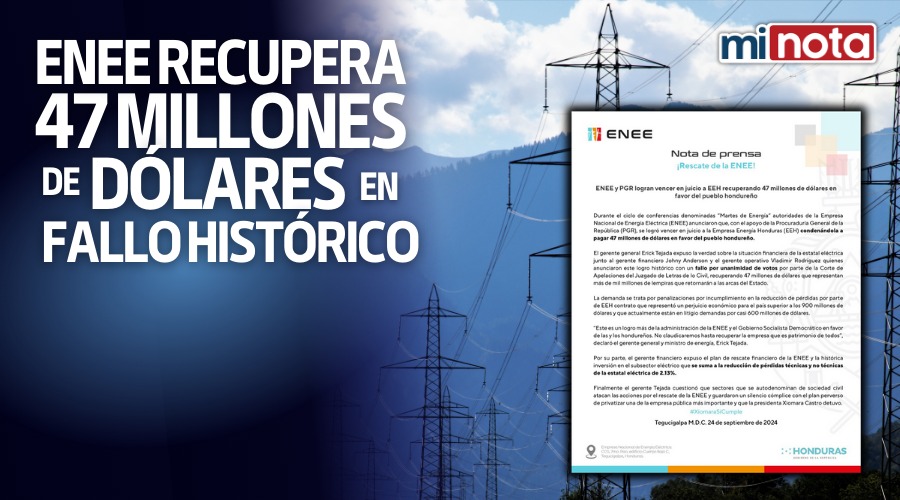 La ENEE, en conjunto con la Procuraduría General de la República (PGR), logran un histórico fallo por unanimidad de votos contra la EEH. Representando más de mil millones de lempiras, marcando un triunfo para el gobierno de la Presidenta Xiomara Castro, en beneficio del pueblo hondureño.