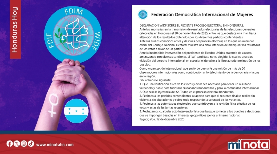 La Federación Democrática Internacional de Mujeres (FDIM) expresó hoy su profunda preocupación por las anomalías detectadas en la transmisión de resultados de las elecciones generales realizadas en Honduras el pasado 30 de noviembre de 2025, y demandó una verificación física de votos y actas para garantizar la transparencia del proceso.