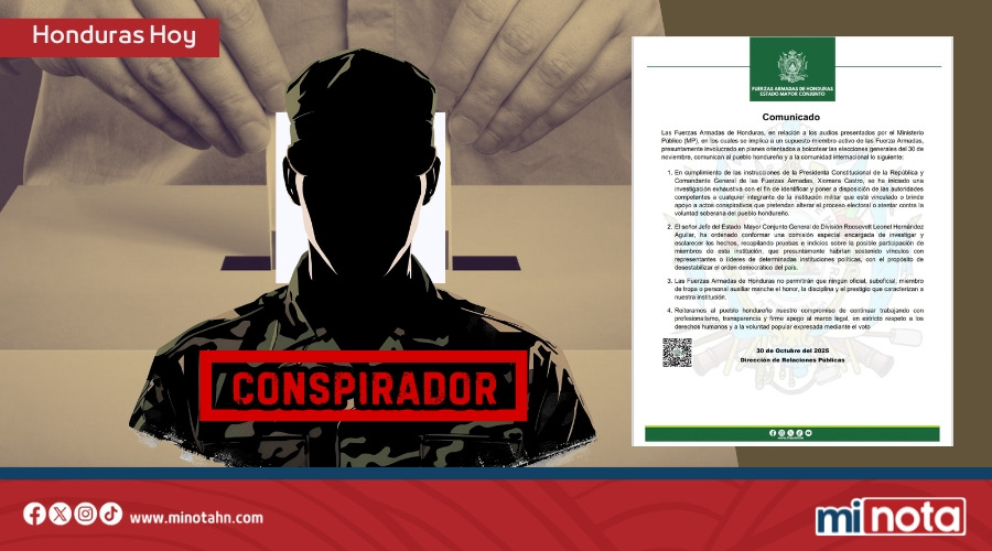 Las Fuerzas Armadas de Honduras (FF. AA.) emitieron un comunicado hoy en respuesta a las recientes denuncias presentadas por el Ministerio Público (MP), que implican a un supuesto miembro activo de la institución en planes orientados a boicotear las elecciones generales del 30 de noviembre.