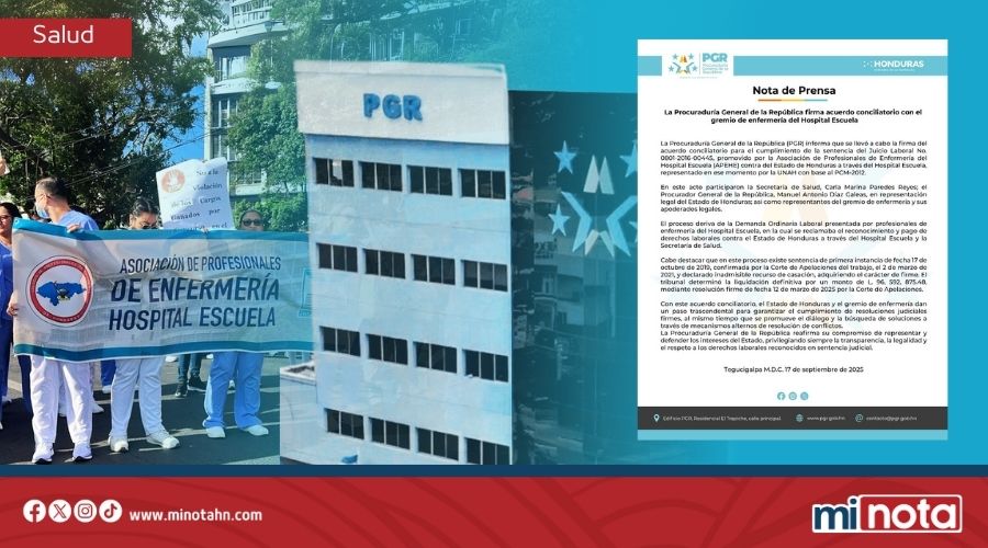 La Procuraduría General de la República (PGR) y el gremio de enfermería del Hospital Escuela (HE) firmaron un acuerdo conciliatorio para resolver el conflicto laboral que se mantenía desde hace varios años, derivado de un juicio laboral.