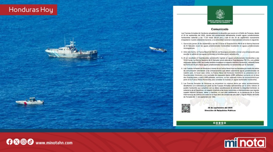 Las Fuerzas Armadas de Honduras informaron que el conflicto en el Golfo de Fonseca continúa tras los incidentes ocurridos desde el 24 de septiembre de 2025, cuando una embarcación salvadoreña ingresó a aguas hondureñas.