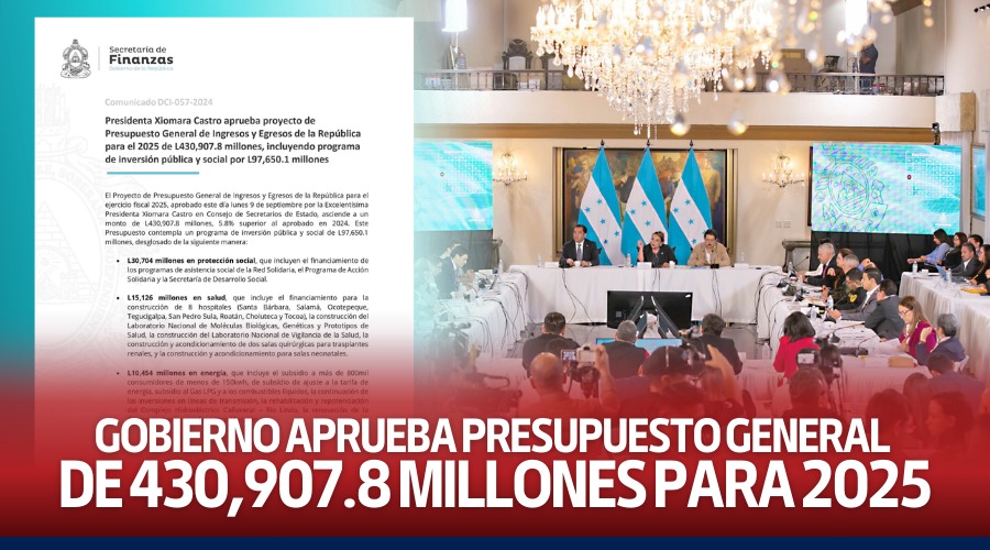 La Presidenta de Honduras, Xiomara Castro, aprobó este lunes 9 de septiembre el Presupuesto General de Ingresos y Egresos de la República para el año 2025 durante una reunión con el Consejo de Secretarios de Estado. El presupuesto aprobado asciende a 430,907.8 millones de lempiras, lo que representa un aumento del 5.8% en comparación con el presupuesto de 2024.