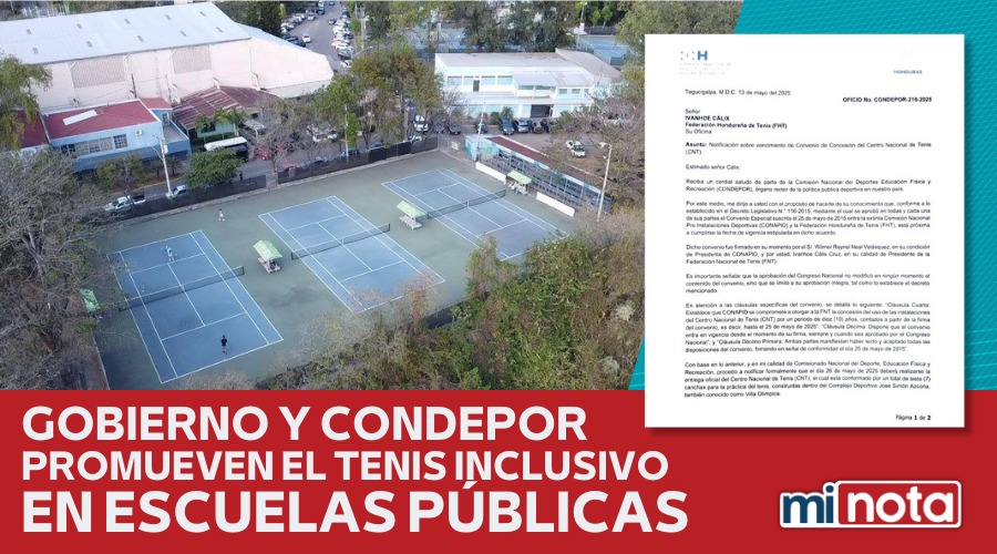 Cabe recordar que, la concesión de 10 años hecha por la extinta Conapid a la Federación Hondureña de Tenis ha llegado a su fin. Por tanto, CONDEPOR anuncia que en cumplimiento de la presidenta Xiomara Castro que garantiza deporte gratis para todos. Pueden acceder a clases sin costo, presentarse en Estadio “Chochi Sosa”, primer nivel. Y preguntar por el licenciado Erick Arrazola, quien brindara todos los detalles.