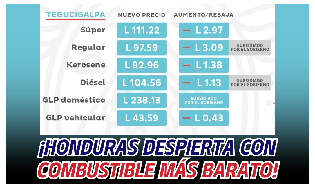 La reducción en el precio del combustible tiene un impacto positivo este lunes en Honduras, y es que el precio del combustible ha bajado gracias al esfuerzo del Gobierno, que trabaja duro para mejorar la vida de todos los hondureños.