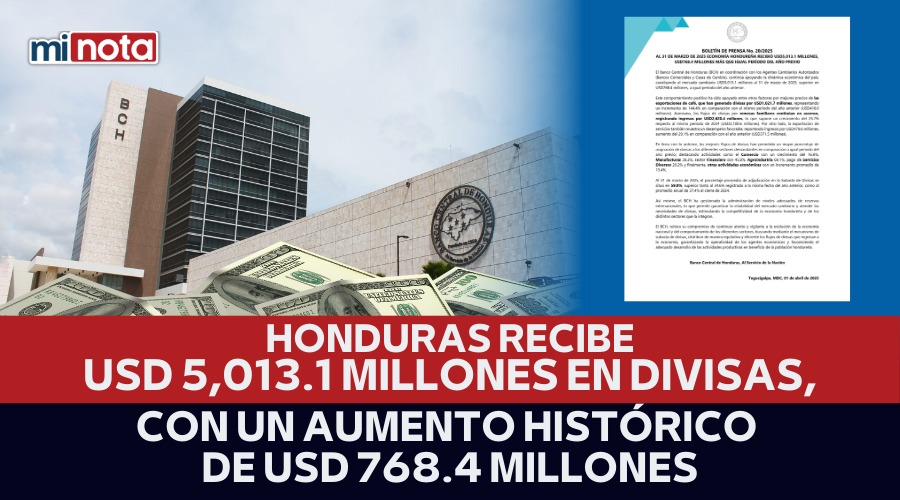 El Banco Central de Honduras (BCH), informó que al 31 de marzo de 2025, el país recibió un total de USD$5,013.1 millones en divisas, lo que representa un incremento de USD$768.4 millones, impulsado por el aumento en las exportaciones, las remesas familiares y los servicios.
