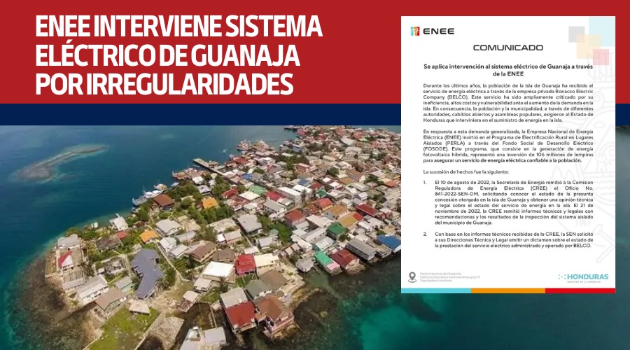 La ENEE emitió un comunicado para aclarar que la intervención a la empresa BELCO, encargada del suministro de Energía en Guanaja, obedece a que operaba al margen de la ley ya que no tenía licencia de desde el 2018 y cobraba tarifa sin ser regulada.