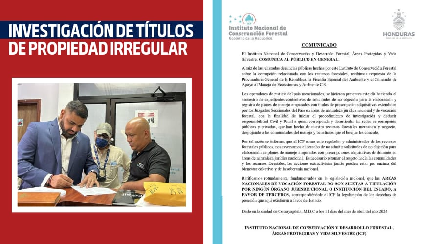 Investigación por parte de La Procuraduría General de la República (PGR) , en colaboración con el Ministerio Público (MP), actualmente están llevando a cabo una respuesta ante denuncia presentada por el Instituto Nacional de Conservación Forestal. El foco de esta investigación son posibles irregularidades relacionadas con la emisión de títulos de propiedad.