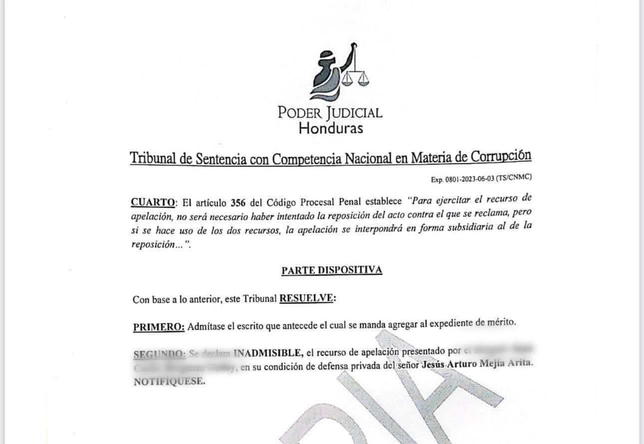 Este viernes fue confirmado por la Corte de Apelaciones de Anti-Corrupción el auto de formal procesamiento contra el nacionalista Mejía por suponerlo responsable de los delitos de violación a los deberes de los funcionarios públicos, al no seguir el procedimiento y los requisitos para la compra de materiales de un proyecto de eléctrificación en un área rural de Intibucá, proyecto que no sería más que una fachada para un acto de corrupción que sirivió para el financimiento de la campaña electoral asistencialista de la Narcodictadura.