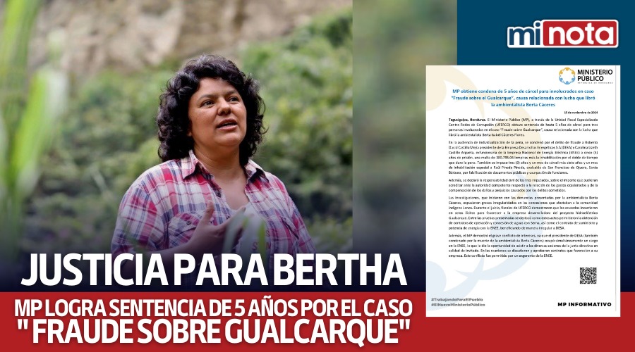 El Ministerio Público (MP), ha logrado una sentencia de cinco años de cárcel para los involucrados en el caso “Fraude sobre el Gualcarque”. Un proceso emblemático vinculado a la lucha liderada por la ambientalista Berta Cáceres.