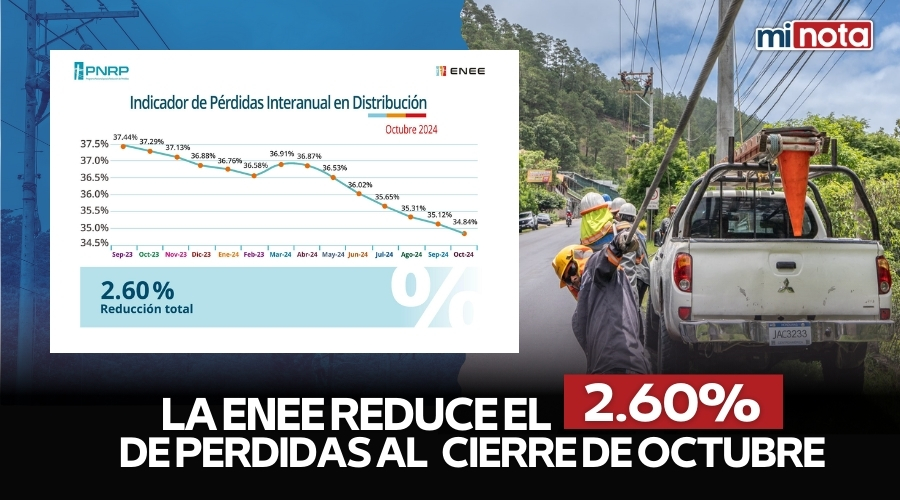 El indicador de pérdidas de la Empresa Nacional de Energía Eléctrica (ENEE), sigue su ruta hacia la baja y se acerca a la meta de reducir 3 puntos porcentuales para finales de este año. Al cierre de octubre el indicador se ubicó en 34,84% reflejando una reducción acumulada de 2,60%. La disminución en octubre fue 0,28%.