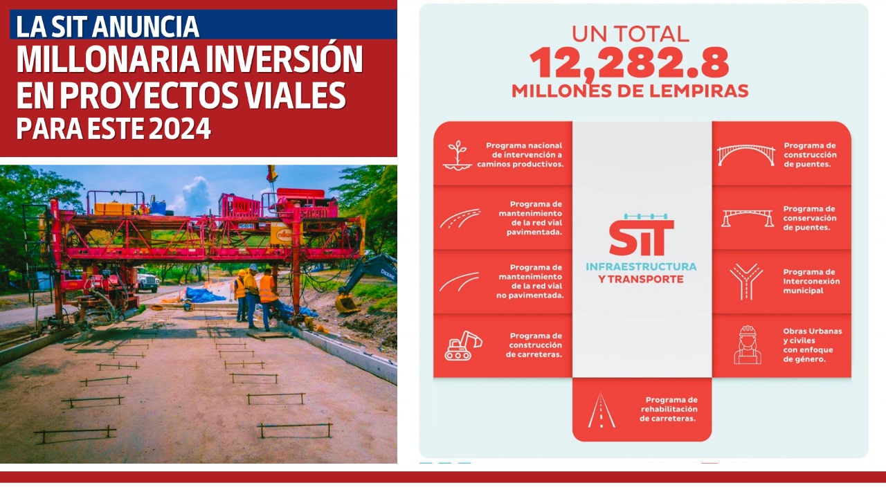 La Secretaría de Infraestructura y Transporte (SIT) reveló que, como parte del Presupuesto General de la República para este 2024, aprobado recientemente por el Congreso Nacional, se le ha asignado a dicha institución una cifra significativa de 12,282.8 millones de lempiras (L) destinados a impulsar proyectos de infraestructura a lo largo del país.