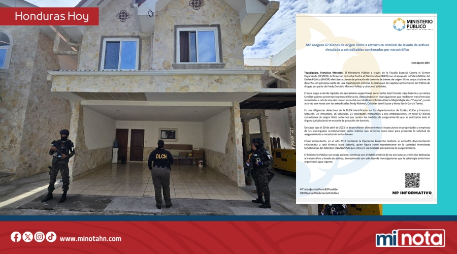 El Ministerio Público (MP) de Honduras aseguró 67 bienes de origen ilícito a una estructura de lavado de dinero conectada a extraditables condenados por narcotráfico. La operación, dirigida por la Fiscalía Especial Contra el Crimen Organizado (FESCCO) y la Dirección de Lucha Contra el Narcotráfico (DLCN), incautó propiedades, vehículos, empresas y embarcaciones en los departamentos de Cortés, Colón y Francisco Morazán.