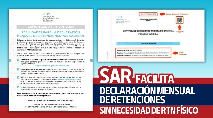 El Servicio de Administración de Rentas (SAR), ha anunciado nuevas facilidades para los Obligados Tributarios en relación con la Declaración Mensual de Retenciones por Salarios, Servicios, Honorarios, entre otros. Según el comunicado, los Agentes Retenedores ya no necesitarán solicitar el carnet o certificado físico del RTN para cumplir con esta obligación, bastará con el número de RTN del retenido.
