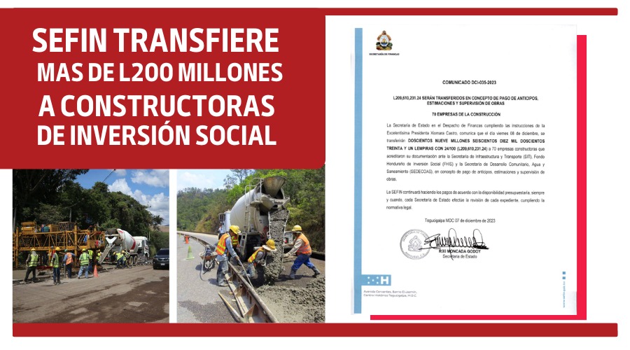 En el comunicado, la SEFIN detalló: «Cumpliendo las instrucciones de la Excelentísima Presidenta Xiomara Castro, comunica que el día viernes 08 de diciembre, se transferirán DOSCIENTOS NUEVE MILLONES SEISCIENTOS DIEZ MIL DOSCIENTOS TREINTA Y UN LEMPIRAS CON 24/100 (L.209,610,231.24) a 70 empresas constructoras que acreditaron su documentación ante la Secretaria de Infraestructura y Transporte (SIT), Fondo Hondureño de Inversión Social (FHIS) y la Secretaría de Desarrollo Comunitario, Agua y Saneamiento (SEDECOAS), en concepto de pago de anticipos, estimaciones y supervisión de obras».