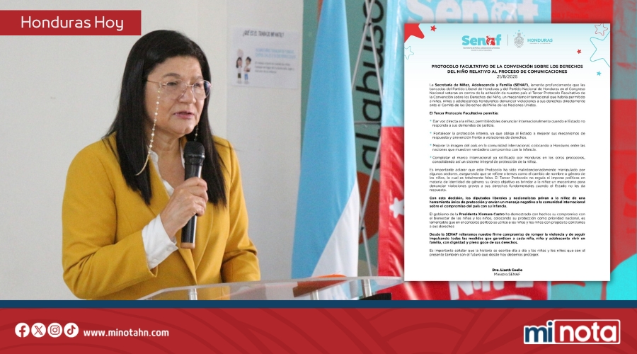 La Secretaría de Niñez, Adolescencia y Familia (SENAF) emitió un comunicado lamentando profundamente que las bancadas del Partido Liberal y el Partido Nacional del Congreso Nacional votaran en contra de la adhesión de Honduras al Tercer Protocolo Facultativo de la Convención sobre los Derechos del Niño.